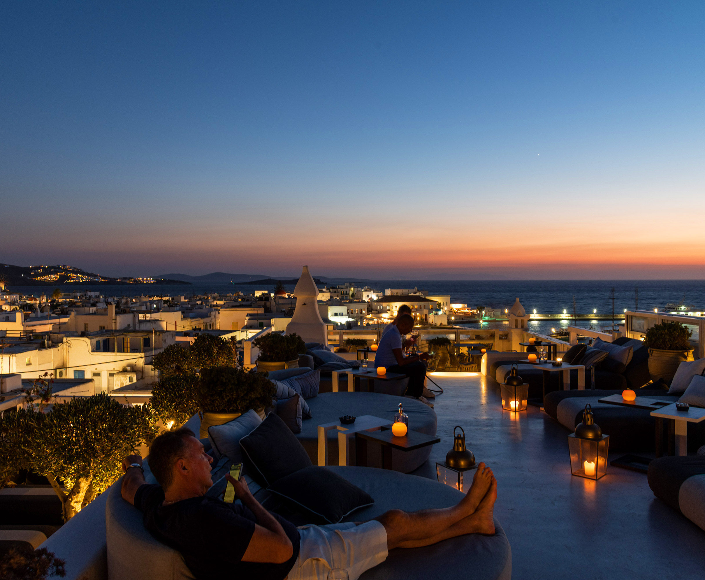 The SKYBAR roof top is the latest addition to the TownHouse experience, overlooking Mykonos town offering breathtaking sunset views!